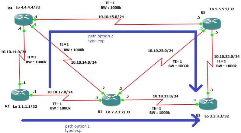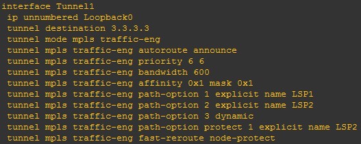 Ta sử dụng path-option 2 làm đường bảo vệ tuyến cho path-option 1 bằng câu lệnh sau : R1(config-if)#tunnel mpls traffic-eng path-option protect 1 explicit name LSP2