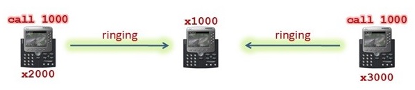 + Trong một trường hợp khác, Giả sử bộ phận chăm sóc khách hàng của công ty XYZ chỉ có một số điện thoại và chỉ có hai nhân viên chăm sóc khách hàng A và B. Khi một khách hàng C gọi đến, điện thoại của hai nhân viên A và B lúc này sẽ reo cùng lúc. Khi nhân viên A đang trả lời cho khách hàng C mà khách hàng D khác cũng gọi đến thì điện thoại của nhân viên B sẽ reo và nhân viên B sẽ đàm thoại với khác hàng D.