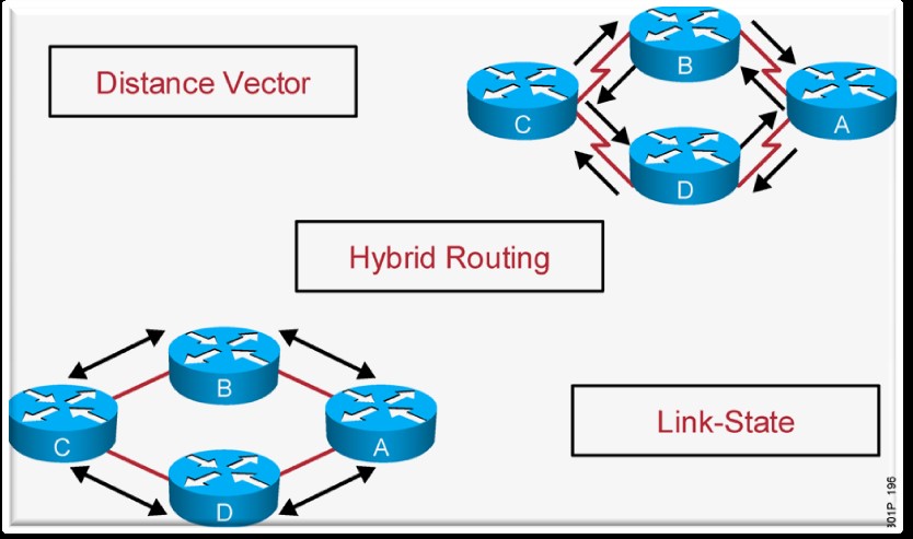 Hybrid Routing, thường được gọi là Blanced-hybird (định tuyến cân bằng), là sự kết hợp của Distance Vector và Link-state, Hybrid Routing sử dụng Distance Vector lấy những số liệu chính xác để xác định những tuyến đường tốt nhất đến mạng đích, và báo cáo thông tin định tuyến khi có sự thay đổi cấu trúc mạng. Hybrid Routing cho phép hội tụ mạng một cách nhanh chóng, CPU hoạt động ít hơn và tốn ít bộ nhớ hơn.