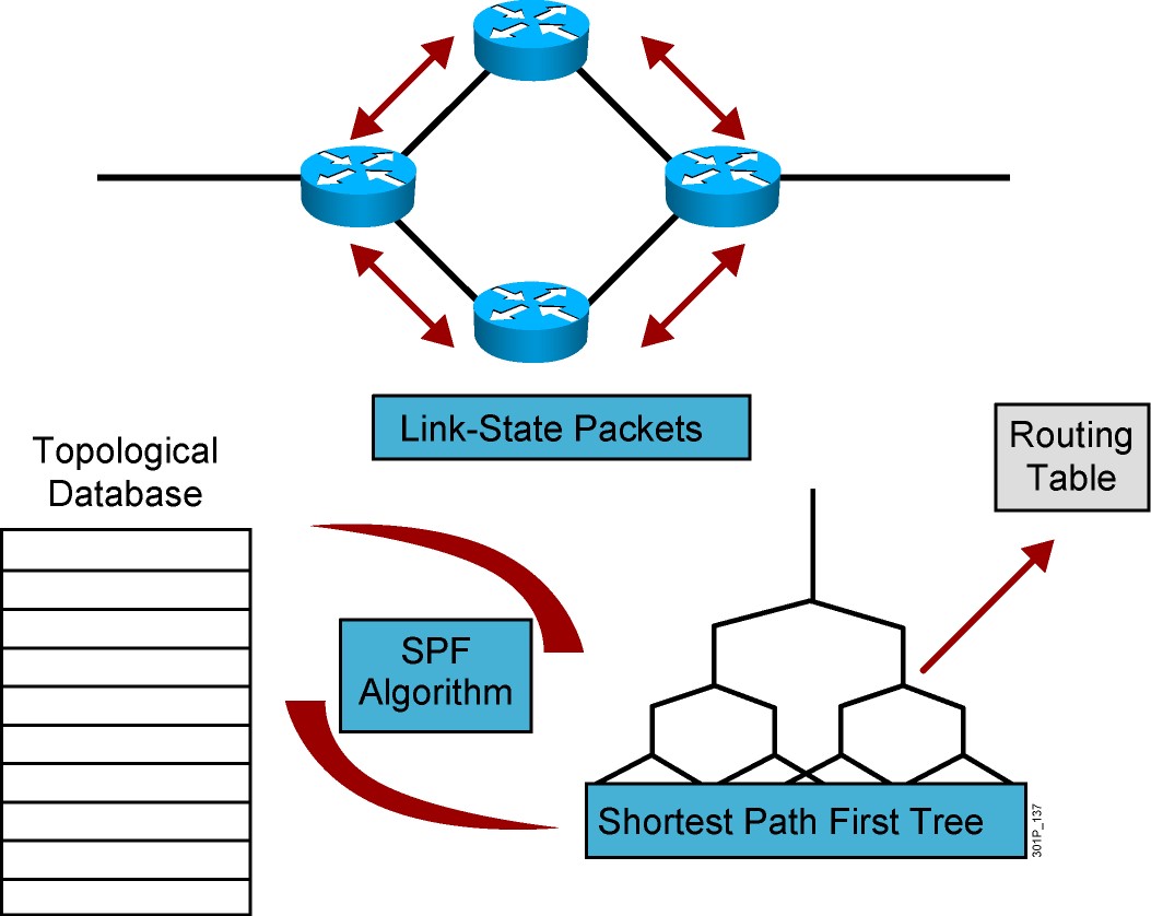 Link-state không gửi bảng định tuyến của mình, mà chỉ gửi trạng thái của các đường Link nằm trong Linkstate-database của mình đi đến các Router khác, các Router sẽ sử dụng giả thuật SPF (Shortest Path First), để tự xây dựng bảng định tuyến cho mình khi mạng đã hội tụ. Hội tụ là quá trình các Router cập nhật các bảng định tuyến khi có sự thay đổi cấu trúc mạng.