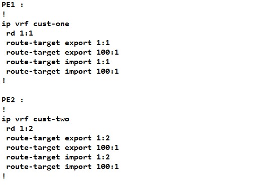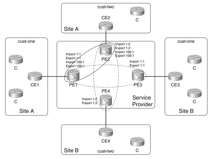Khi cấu hình một VRF với nhiều site thuộc về một VPN, mà không cần giao tiếp với các site thuộc về một VPN khác, chúng ta chỉ cần cấu hình một RT cho việc nhập và xuất trên tất cả các router PE với một site thuộc về VRF đó. Đây là trường hợp đơn giản của một mạng nội bộ (intranet). Khi có nhiều site thuộc về mọt VPN cần có khả năng giao tiếp với các site của một VPN khác (trường hợp extranet), chúng ta cần chú ý cấu hình RT cho chính xác. Xem hình tiếp theo để thấy một ví dụ về extranet.