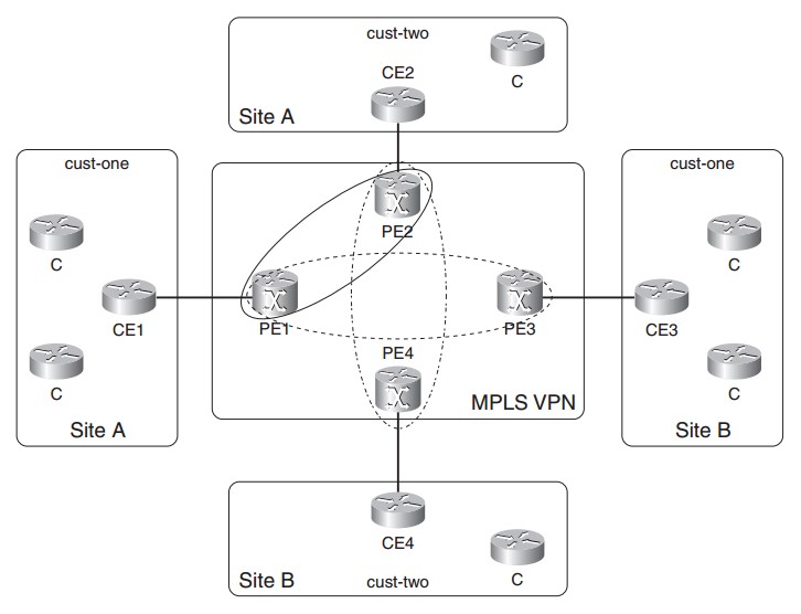 Rõ ràng, site A và site B từ VRF cust-one phải có khả năng giao tiếp với nhau. Tương tự nó cũng đúng trên site A và site B của VRF cust-two. RT mà VPN cust-one sử dụng là 1:1. RT mà VPN cust-two sử dụng là 1:2. Bây giờ hình dung chỉ site A của VRF cust-one cần giao tiếp với chỉ site A của VRF cust-two. Điều này hoàn toàn có thể và được xác định bằng cách cấu hình RT phù hợp. Với RT 100:1 là xuất khẩu và nhập khẩu cho site A của VRF cust-one và site A của VRF cust-two để đạt được điều này. Việc giao tiếp này gọi là extranet. Hình 2 cho chúng ta thấy một mạng tương tự như hình 1 nhưng có thêm các RT