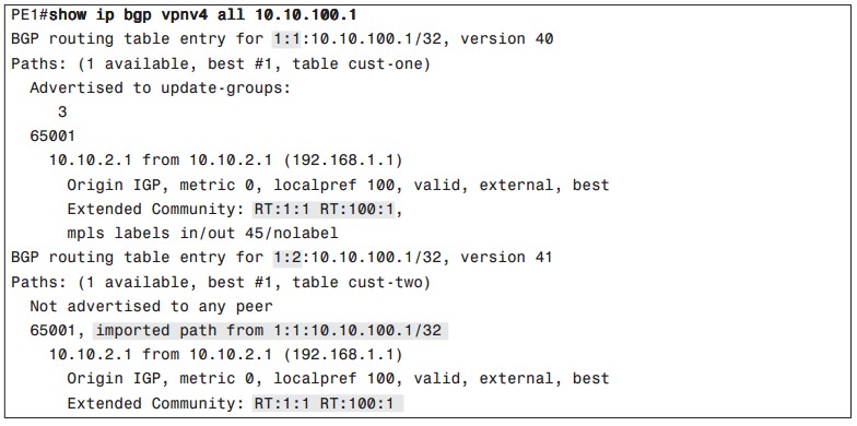 Ví dụ dưới này cho ta thấy một tuyến 10.10.100.1/32. Nó là một tuyến với RD 1:1 (VRF cust-one) được nhập khẩu vào VRF cust-two và trở thành một tuyến vơnv4 với RD 1:2.