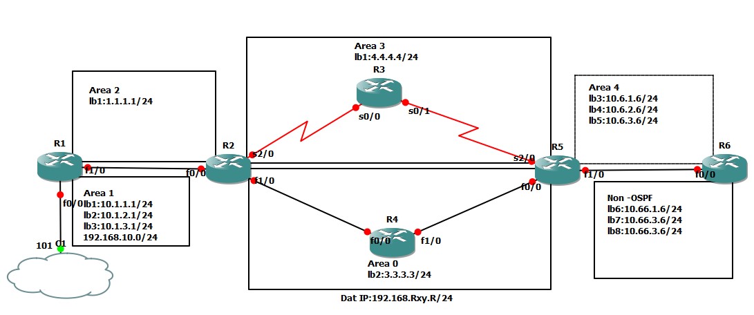 - R6: Không học được các route từ mạng thuộc area 1 vì area 1 không kết nối trực tiếp với area 0 nên các thong tin sẽ không học được, muốn có được các route từ area 1 thì phải cấu hình virtual-link cho area 2 (giữa Router ABR là R1 và R2).