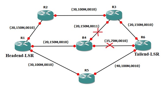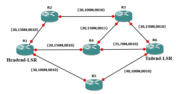 Ta xét một ví dụ về tính toán đường dẫn LSP ràng buộc cho một trung kế lưu lượng thiết lập giữa R1 trong vai trò Headend-LSR và R6 trong vai trò Tailend-LSR như hình dưới: R1 thiết lập một đường dẫn ràng buộc tới R6 cho các lưu lượng của trung kế lưu lượng có yêu cầu là: