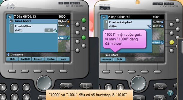 Bước 1: Client thực hiện cuộc gọi đến số Huntstop “1010” của số máy “1000” và “1001”