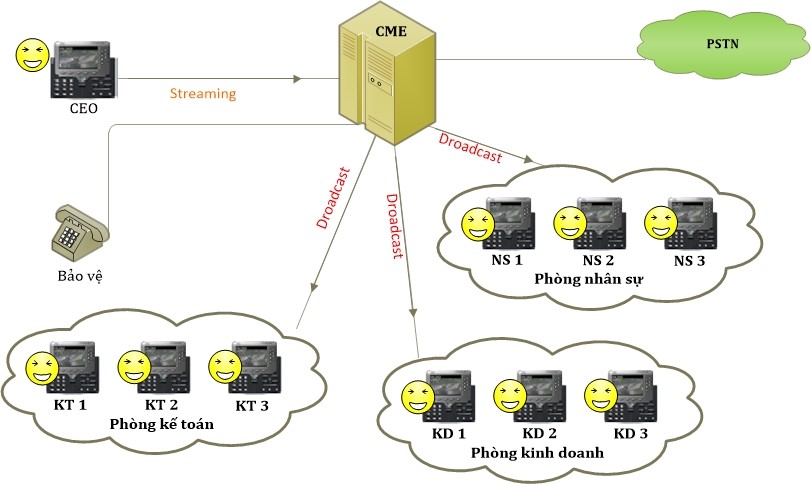 • Hệ thống tổng đài định tuyến nội bộ CME hỗ trợ tối đa 10 group. Và như vậy, bạn có thể thông báo cho tất cả các group từ chính điện thoại IP-Phone ngay tại bàn làm việc của mình và thông báo của bạn sẽ được phát ngay lập tức trên các máy điện thoại IP-Phone trong các group mà bạn đã quy định.