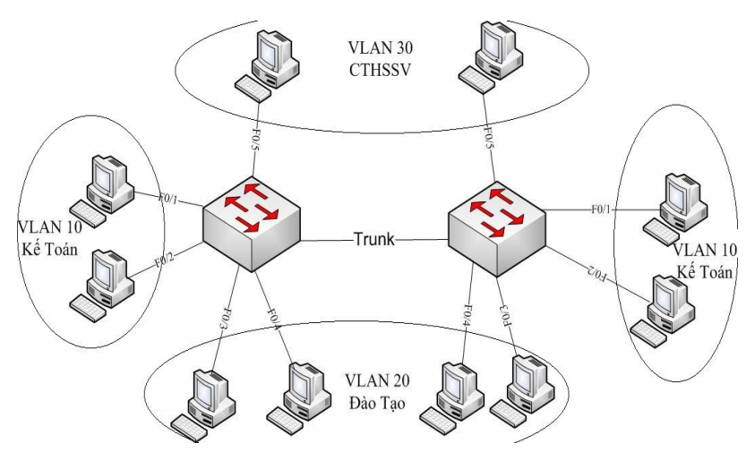 Trong ví dụ này ta sẽ tạo 3 VLAN như trên hình, với cổng f0/1,f0/2 thuộc VLAN 10 dành cho nhân viên Kế toán, f0/3,f0/4 thuộc VLAN 20 dành cho nhân viên phòng Đào tạo, f0/5 thuộc VLAN 30 dành cho nhân viên phòng CTHSSV.