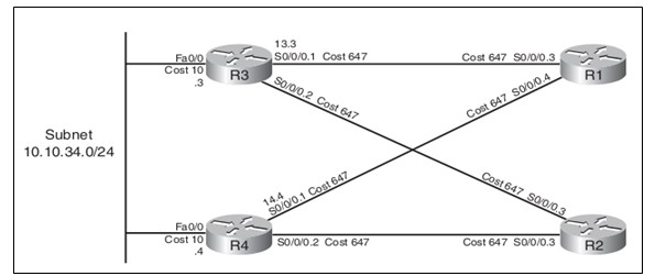 Trong mô hình mạng trên thì các Router đều nằm chung một area 34. Trong mô hình đã mô tả về interfaces number và cost. Bây giờ ta sẽ xét xem các bước để R1 có thể học về thông tin mạng 10.10.10.0/24.