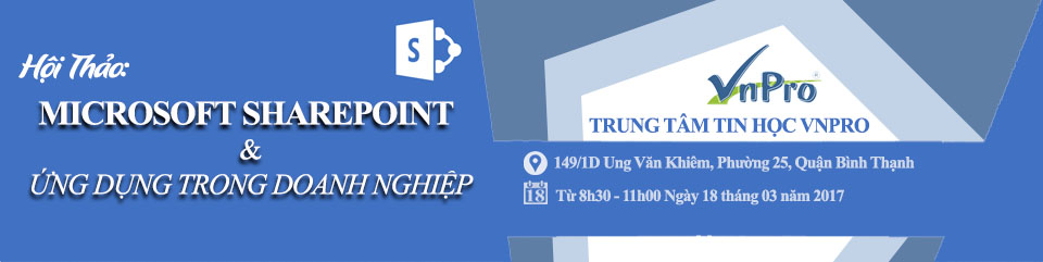 Để cùng trao đổi về những vấn đề trên, VnPro tổ chức buổi hội thảo chuyên đề “MICROSOFT SHAREPOINT VÀ ỨNG DỤNG TRONG DOANH NGHIỆP”. VnPro kính mời các anh/chị học viên, các bạn sinh viên và các anh/chị đang học tập và làm việc trong lĩnh vực công nghệ thông tin và viễn thông tham dự chương trình hội thảo để cùng được chia sẻ, thảo luận về chủ đề đang rất được quan tâm này. * Thời gian: 8h30 – 11h30, 18/03/2017 * Địa điểm: Trung Tâm Tin Học VnPro, 149/1D Ung Văn Khiêm, P. 25, Q. BìnhThạnh. * Phí tham dự: MIỄN PHÍ * ĐĂNG KÝ: Đến với hội thảo lần này, không chỉ là những kiến thức từ chương trình, mà khách mời còn có cơ hội nhận được nhiều quà tặng có giá trị từ VnPro. Do số lượng chỗ ngồi có hạn, Anh/Chị vui lòng đăng ký trước ngày 17/03/2017. Thông tin chi tiết hội thảo vui lòng liên hệ:TRUNG TÂM TIN HỌC VNPRO